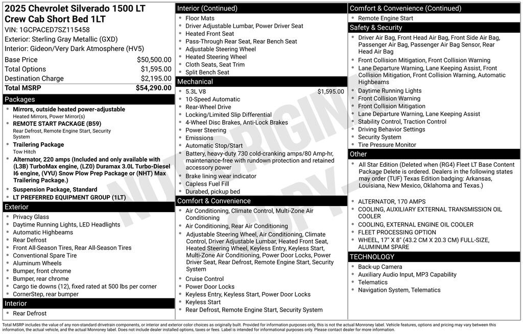 The Silverado 1500 LT comes equipped with a comprehensive Convenience Package, Remote Start Package, and Standard Suspension Package, ensuring a seamless and enjoyable driving experience. Standout features include dual rear USB ports, dual-zone automatic climate control, a heated steering wheel, and a 10-way power driver's seat with lumbar support.