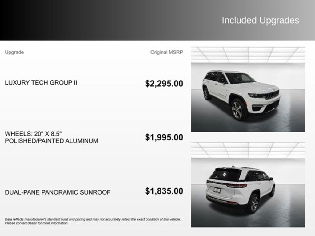 Powered by a 2.0L I4 DOHC engine paired with an 8-speed automatic transmission and 4-wheel drive, the Grand Cherokee 4xe delivers a dynamic and responsive driving experience. Seamlessly blending electric and gasoline power, this advanced plug-in hybrid system provides impressive fuel efficiency without compromising the legendary Jeep capability you expect.